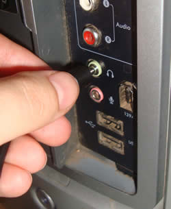 - Take the black cord with the two mini plugs and plug one end into the audio output of your computer (speaker or headphone jack). The other end plugs into the Electrobooster