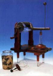 Also on view is a Leyden jar of the period, it being 6.5 in. in height and 4 in. in diameter. Treatment by this method of storing an accumulated charge was also used, but it is recorded that Wesley himself preferred the machine. Possibly the more vigorous and obvious method appealed to a man of his temperament. Wesley is known to have had at least four machines in his possession. (Woodward,